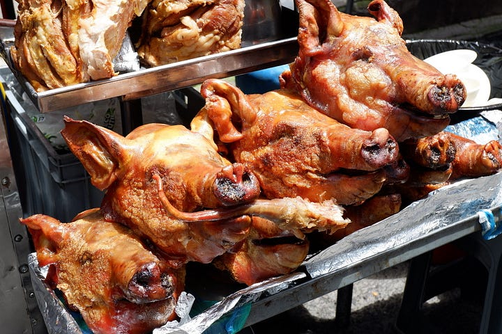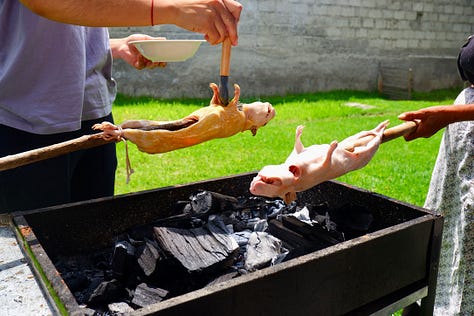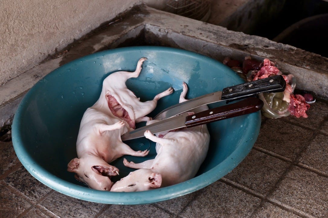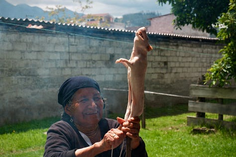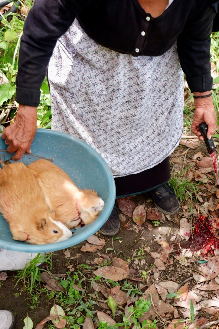 They only became uglier from there. We dipped them in boiling water and plucked out clumps of fur by hand; now hairless and ghostly white, their stomachs were sliced open and their green-gray guts spilled out. Teeth sawed with a knife, jaws snapped out of place — by the end, they looked less like guinea pigs and more like Gollum from Lord of the Rings. My appetite felt spoiled.