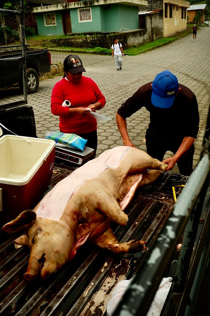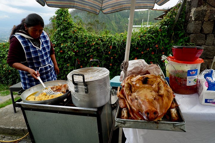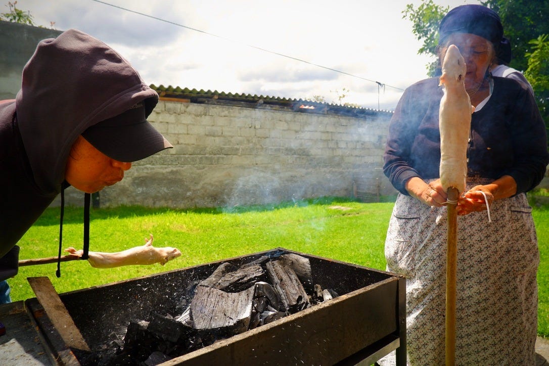 I was staying with an Indigenous Kichwa family in a small mountain town called Peguche, just outside of Otavalo, Ecuador. Goddamn, I was absolutely spoiled — it was the family of a street musician I’d met in Seattle, and their “mi casa es tu casa” hospitality went further than I ever expected. They wanted to give me a real family experience, and that began with a very labor-intensive meal.