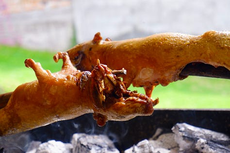 They were salted, seasoned, and fitted on thick skewers so we could roast them over an open fire — a bit like marshmallows, just a little less “sweet.” After almost an hour, their skin crackled to a dark golden-brown and juices hissing out every so often. They were ready to eat.